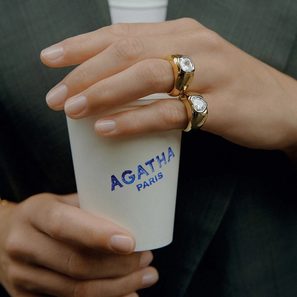 Bague bombée, en laiton doré 750/1000, oxyde de zirconium en forme de coeur souligné par une bordure en laiton rhodié.