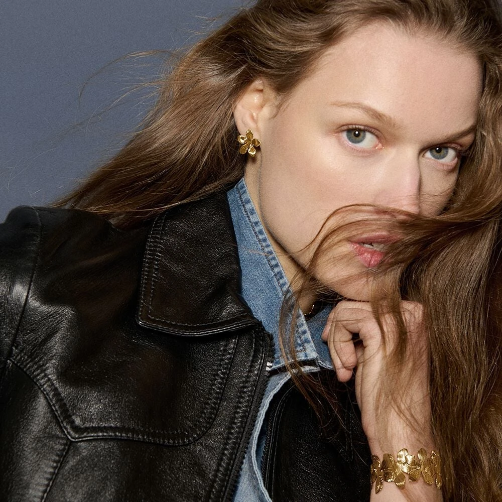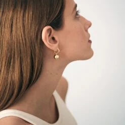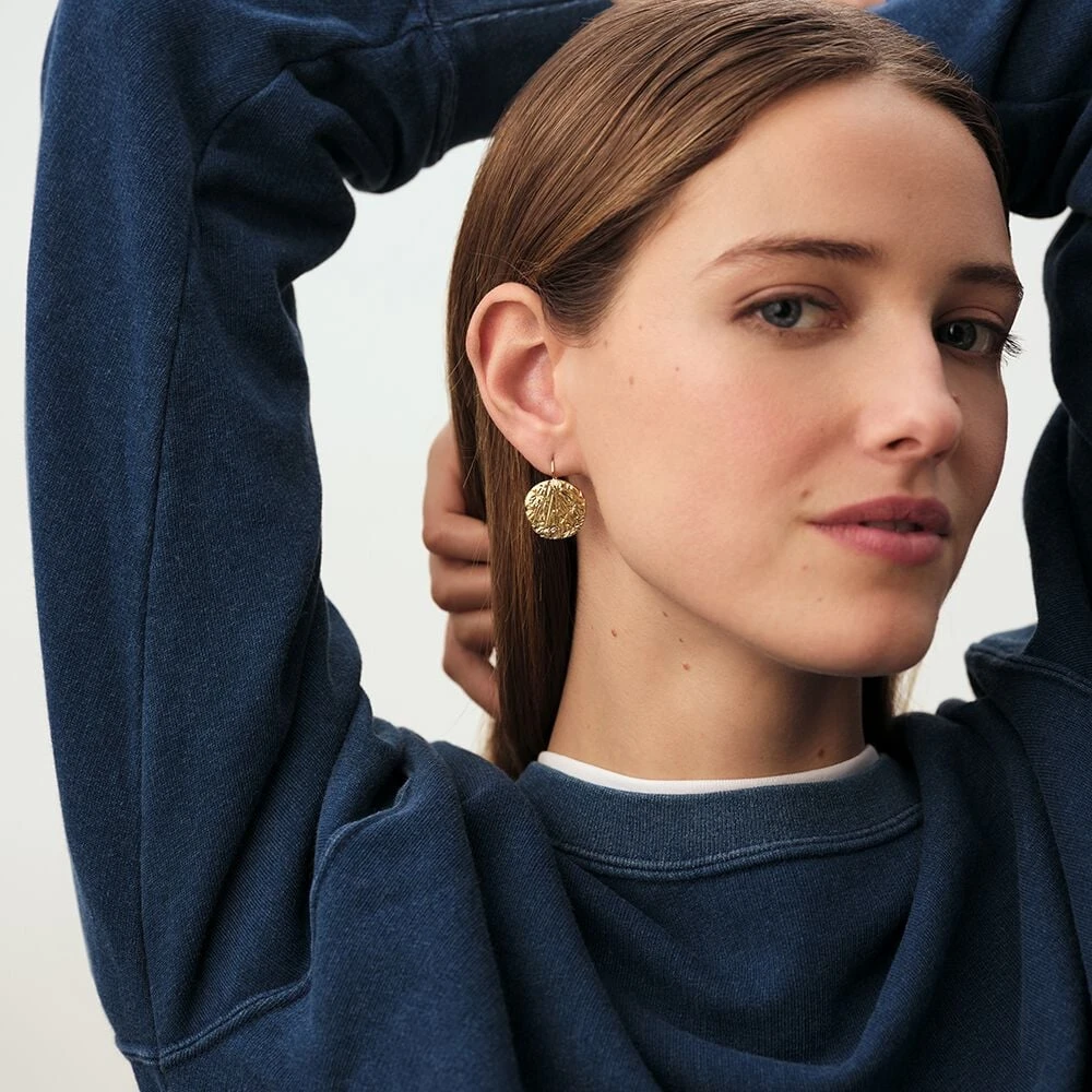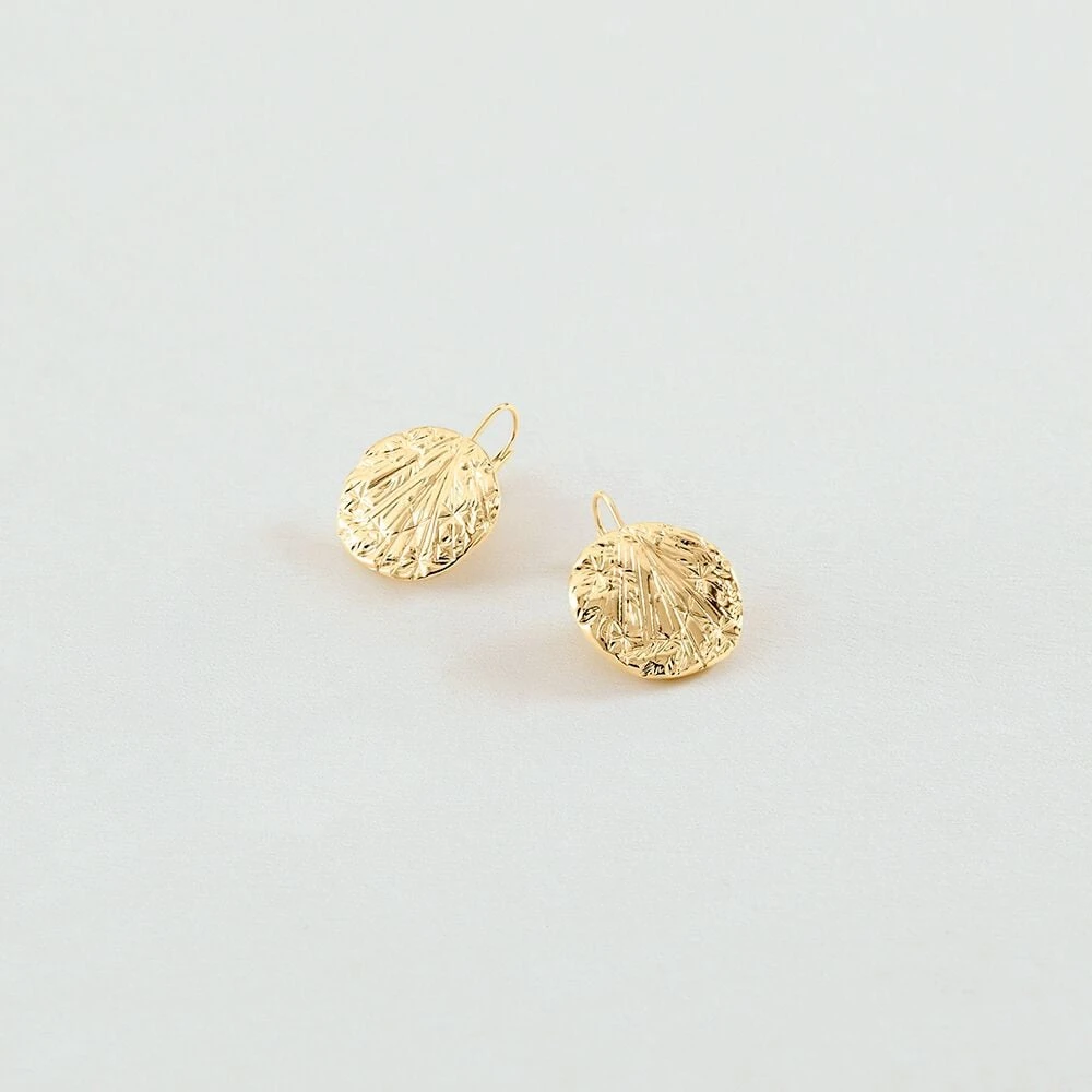 Boucles d’oreilles dormeuses, en mĂ©tal dorĂ© 750/1000, mĂ©daille gravure ‘rayonnant’.