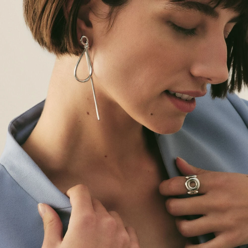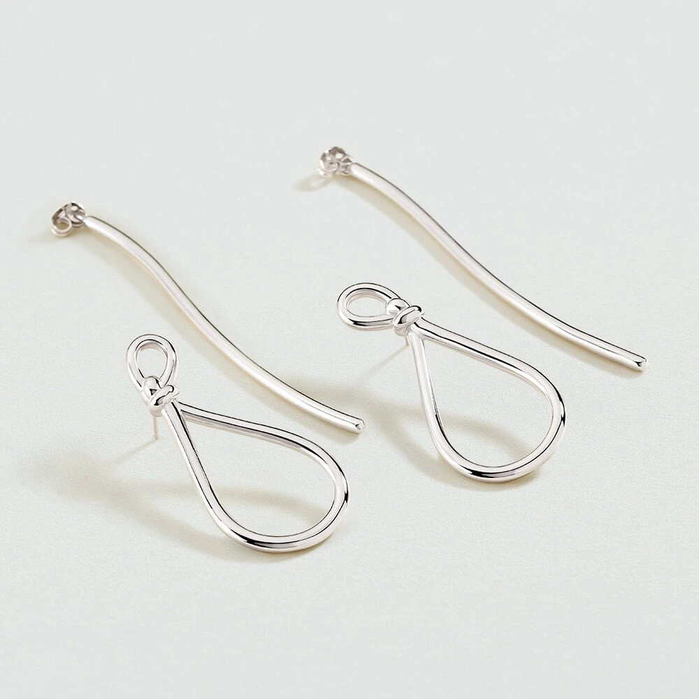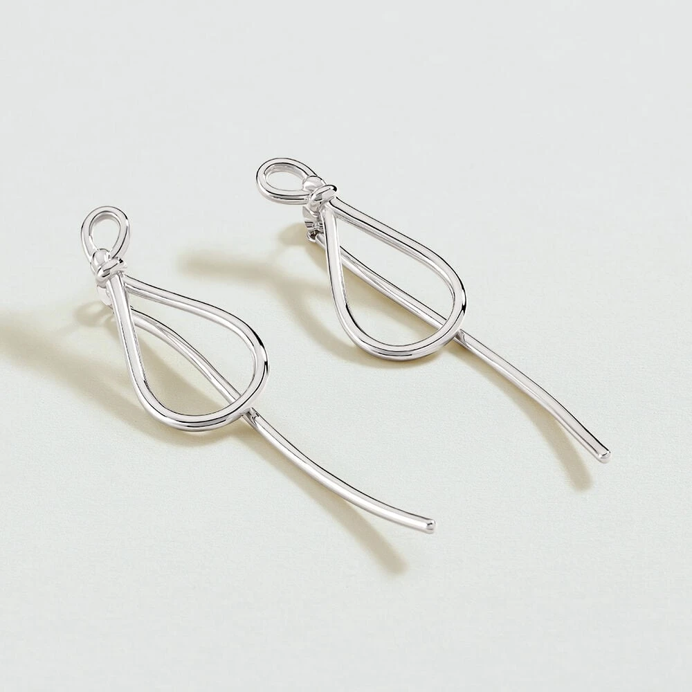 Boucles d’oreilles longues en laiton rhodiĂ© en forme de nĹ“uds pouvant se porter avec ou sans la tige au dos.