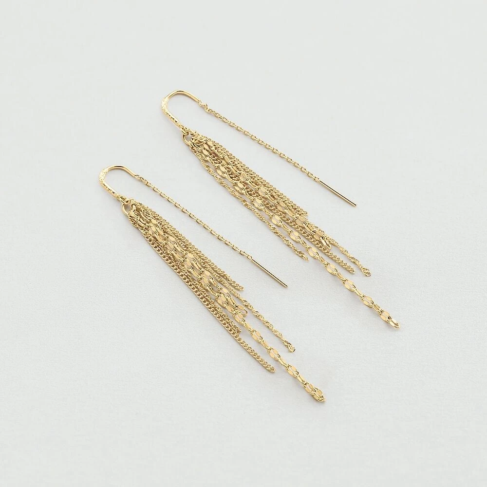 Boucles d’oreilles mi-longues, en laiton doré 750/1000, faites d’un pompom de 6 chaines de différentes longueurs .