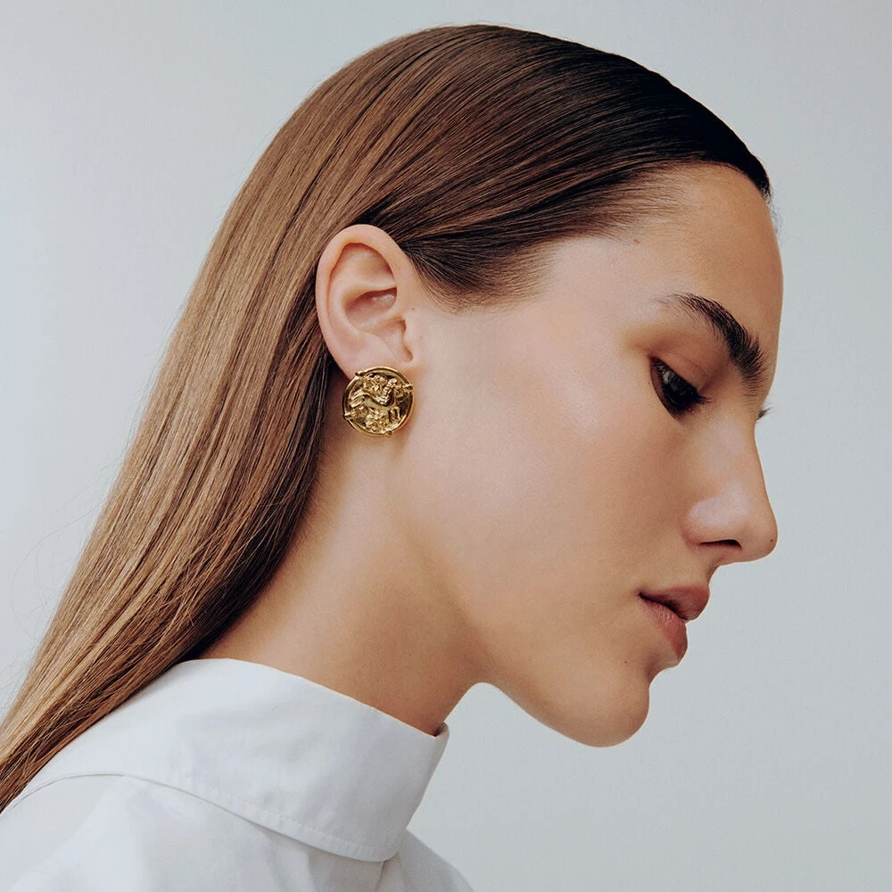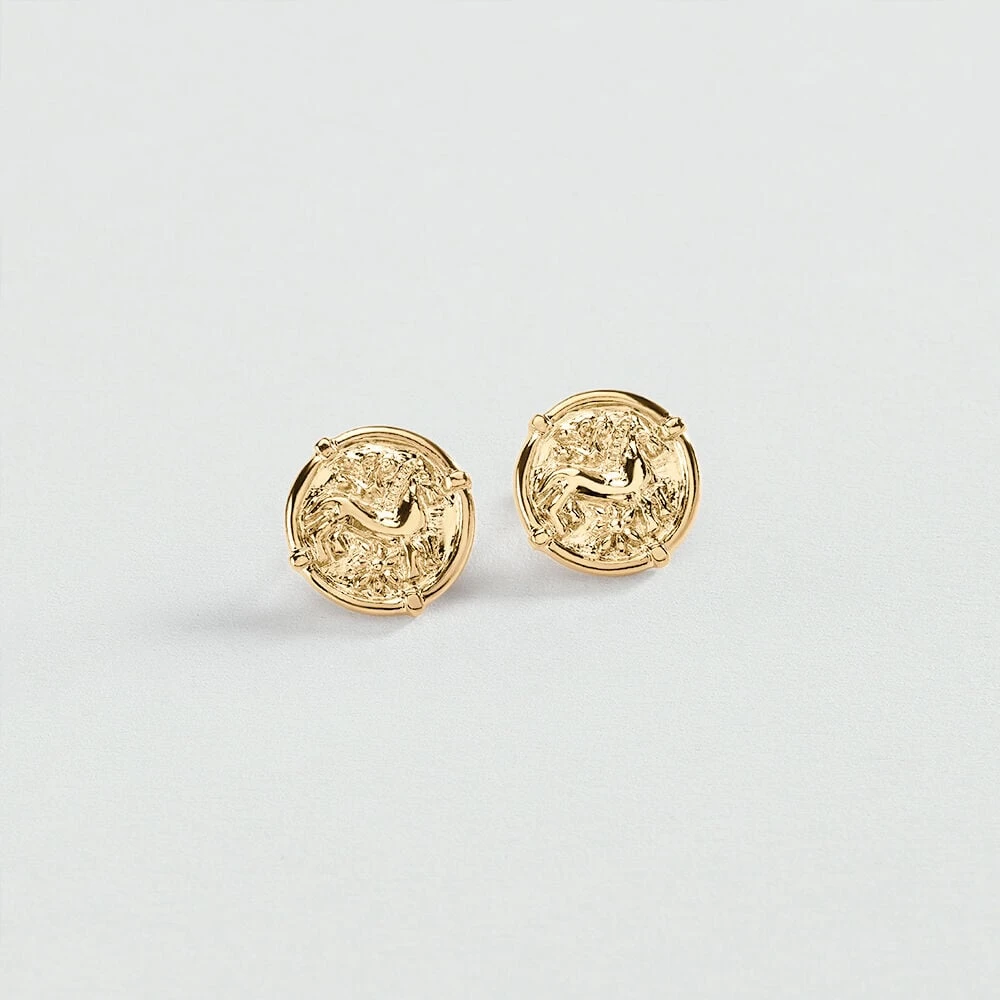 Boucles d’oreilles en mĂ©tal dorĂ© Ă l’or fin plastron en forme de mĂ©daille symbolisant un cheval.