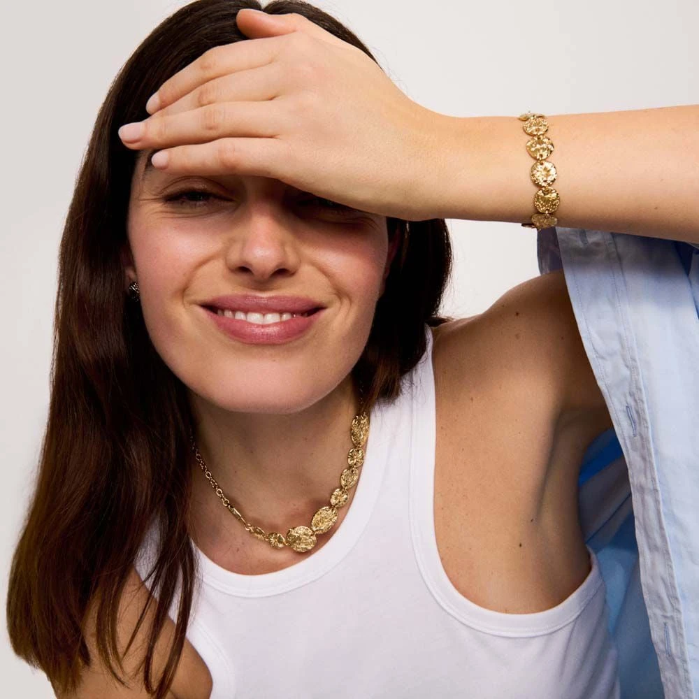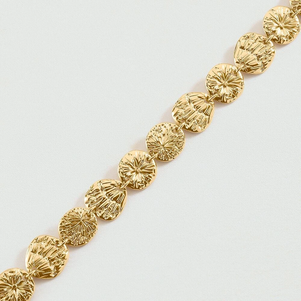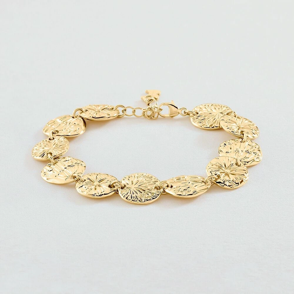 Bracelet, en mĂ©tal dorĂ© 750/1000, mĂ©dailles avec gravure’ rayonnant’. Ce bijou mesure 150mm et contient une rallonge de 30mm