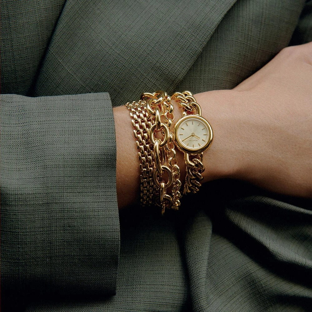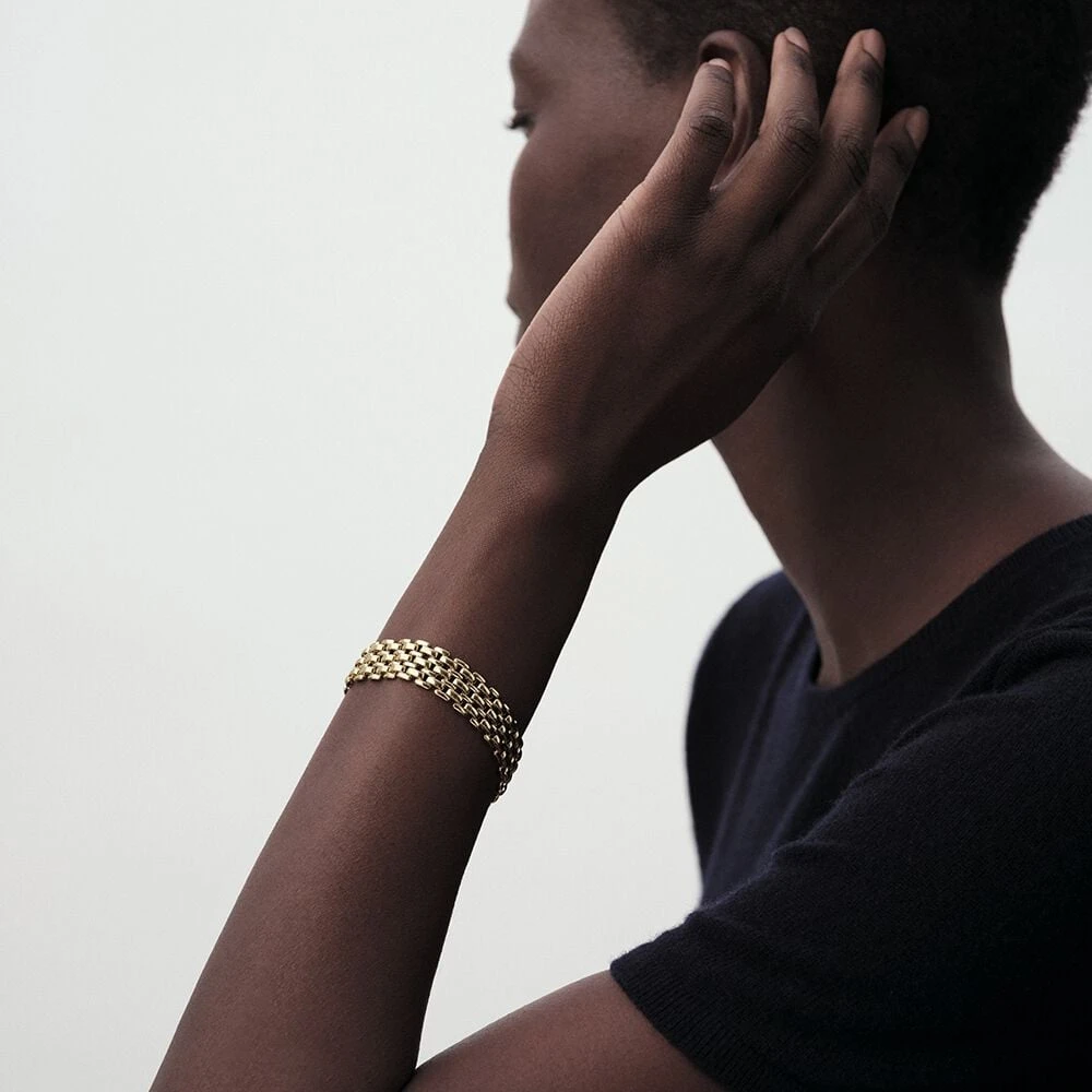 Bracelet, en laiton et étain, dont la maille ressemble à une maille de montre. Ce bijou mesure 170mm et contient une rallonge de 30mm