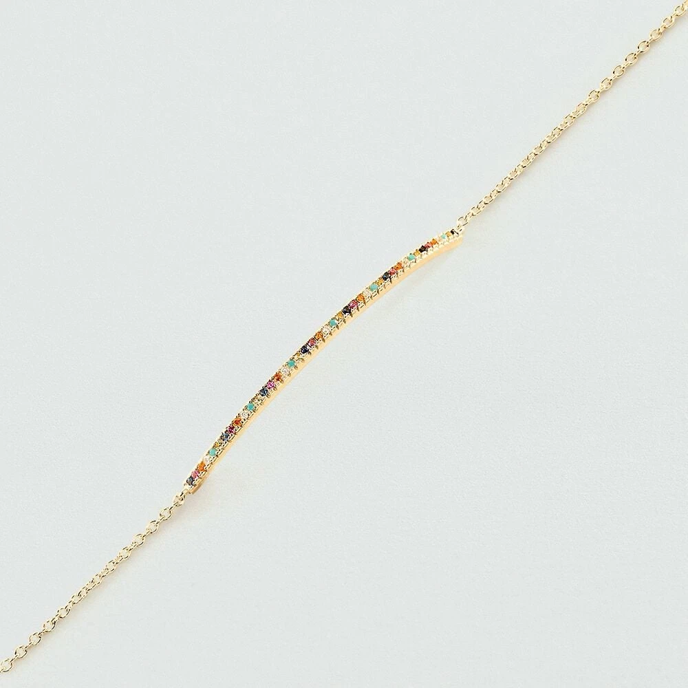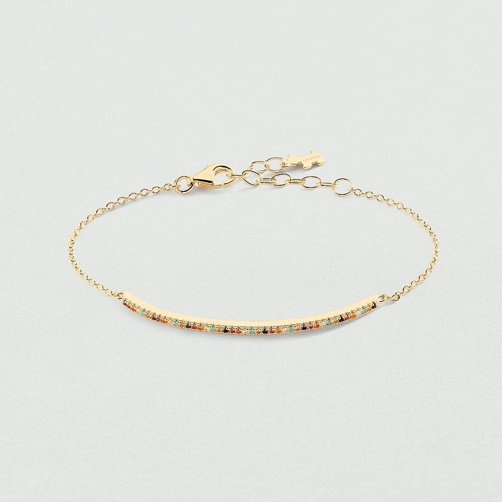 Bracelet souple en argent véritable doré 750/1000 avec une section pavée d’oxydes de zirconium multicolores. Ce bijou mesure 150mm et contient une rallonge de 30mm