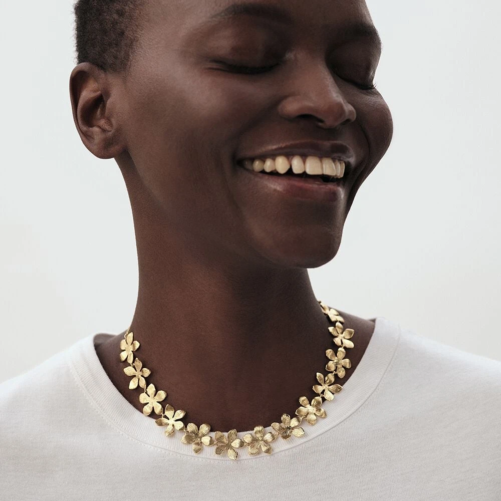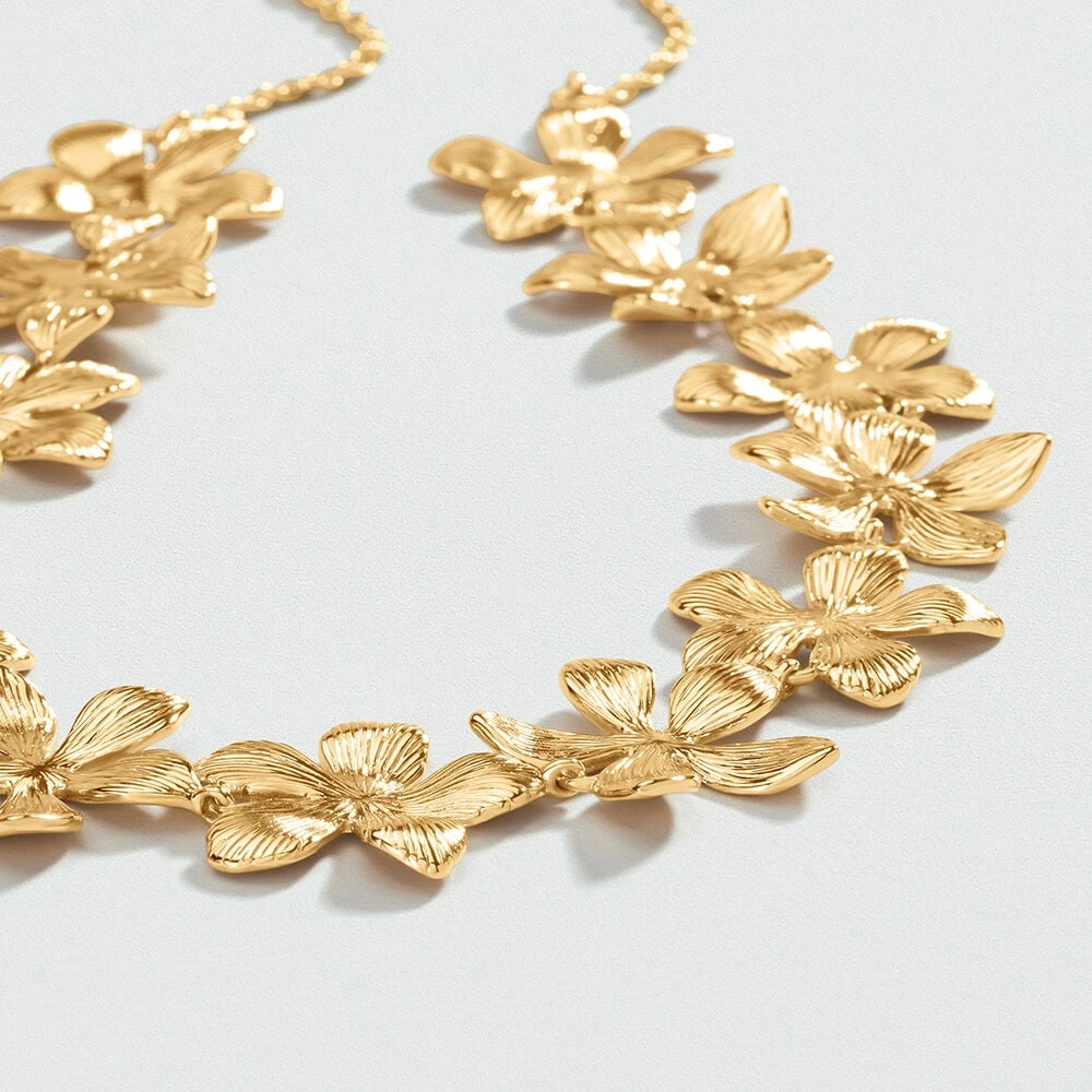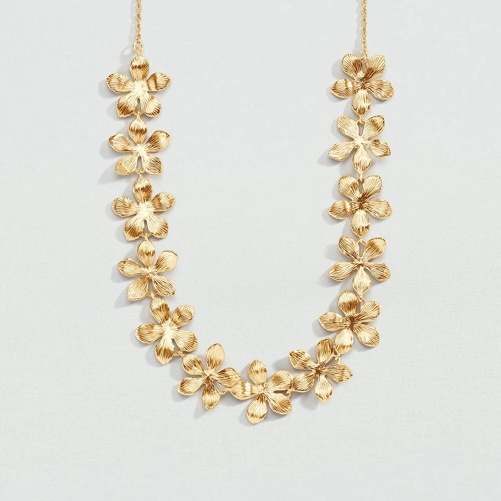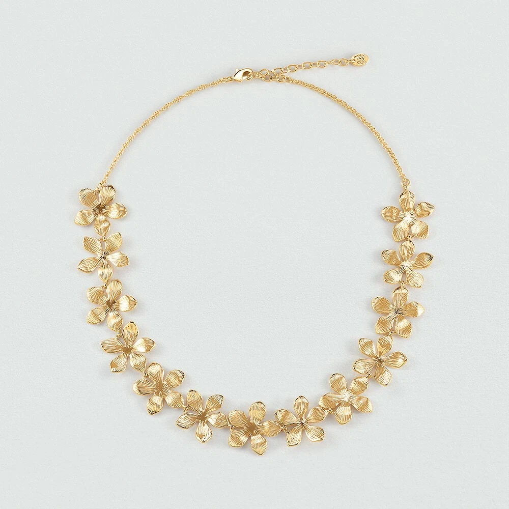 Collier court en laiton doré 750/1000, multitude de petites fleurs. Ce bijou mesure 390mm et contient une rallonge de 50mm