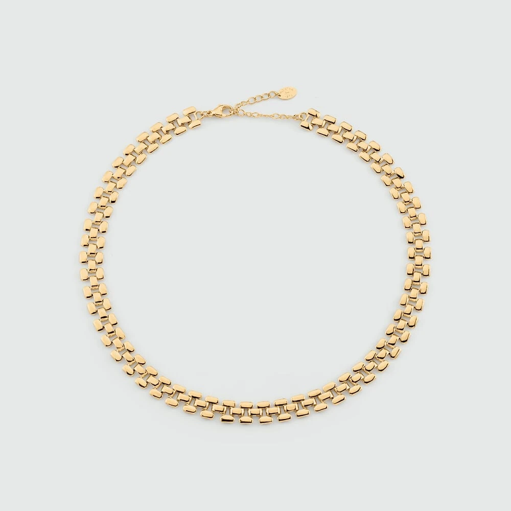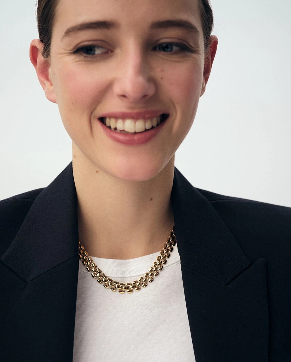 Collier court en étain doré à l’or 750/1000 maille montre.. Ce bijou mesure 420mm et contient une rallonge de 50mm